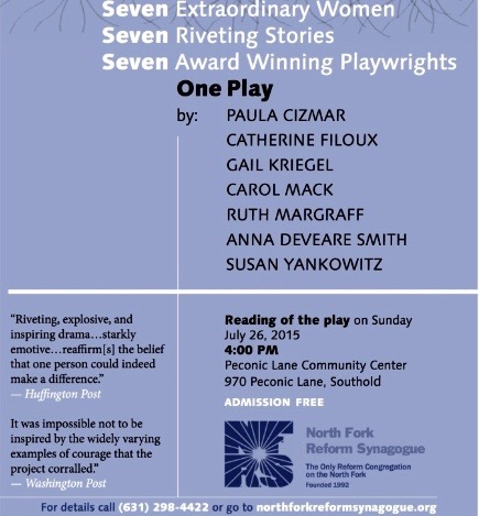 A summertime performance of SEVEN was held on the North Fork of Long Island, New York on July 26. The reading was presented at the Peconic Lane Community Center in Southold, sponsored by the North Fork Reform Synagogue. It was directed by Gail Kriegel, one of the playwrights of SEVEN, who described the play in local media as “a dramatic piece about extraordinary women leaders from around the world who have risked their lives to fight injustice, trafficking, corruption, domestic violence, and poverty.” The cast included: Carol Brown, Ruth Eilenberg, Kay Freeman, Sara Zarem Levin, Toni Munna, Beverly Price, Peggy Schwartz, and Stephanie Zinger.